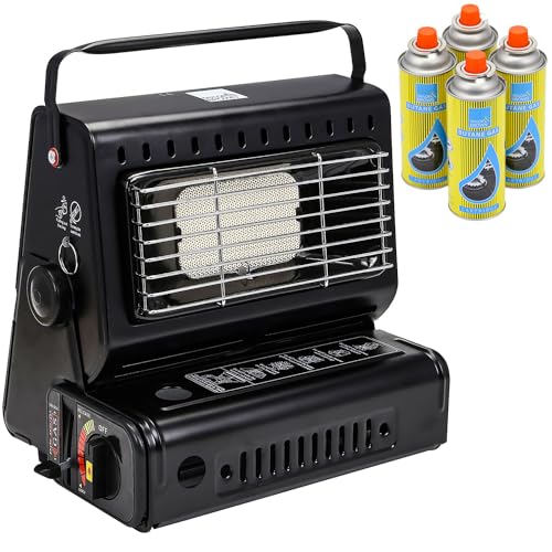 PORTABLE GAS HEATER OUTDOOR CAMPING FISHING + 4 BUTANE GAS BOTTLES CANISTERS NEW