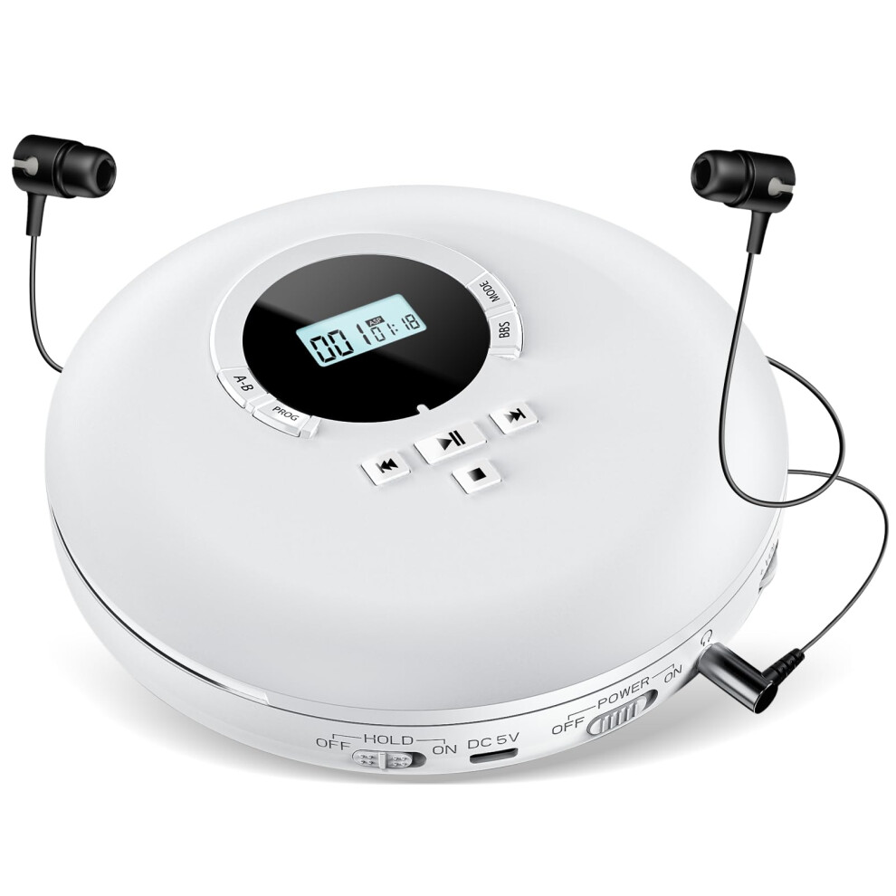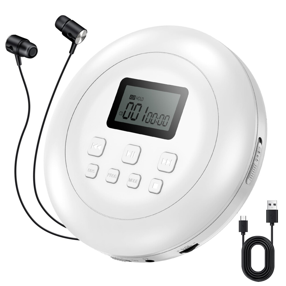 August SE10W Portable Rechargeable CD Player for Home, Car & Travel – Personal Discman MP3 Music Player with Earphones, LCD Display, EQ & Anti-Shock, Disc/Micro SD Support, 15H Playback – White