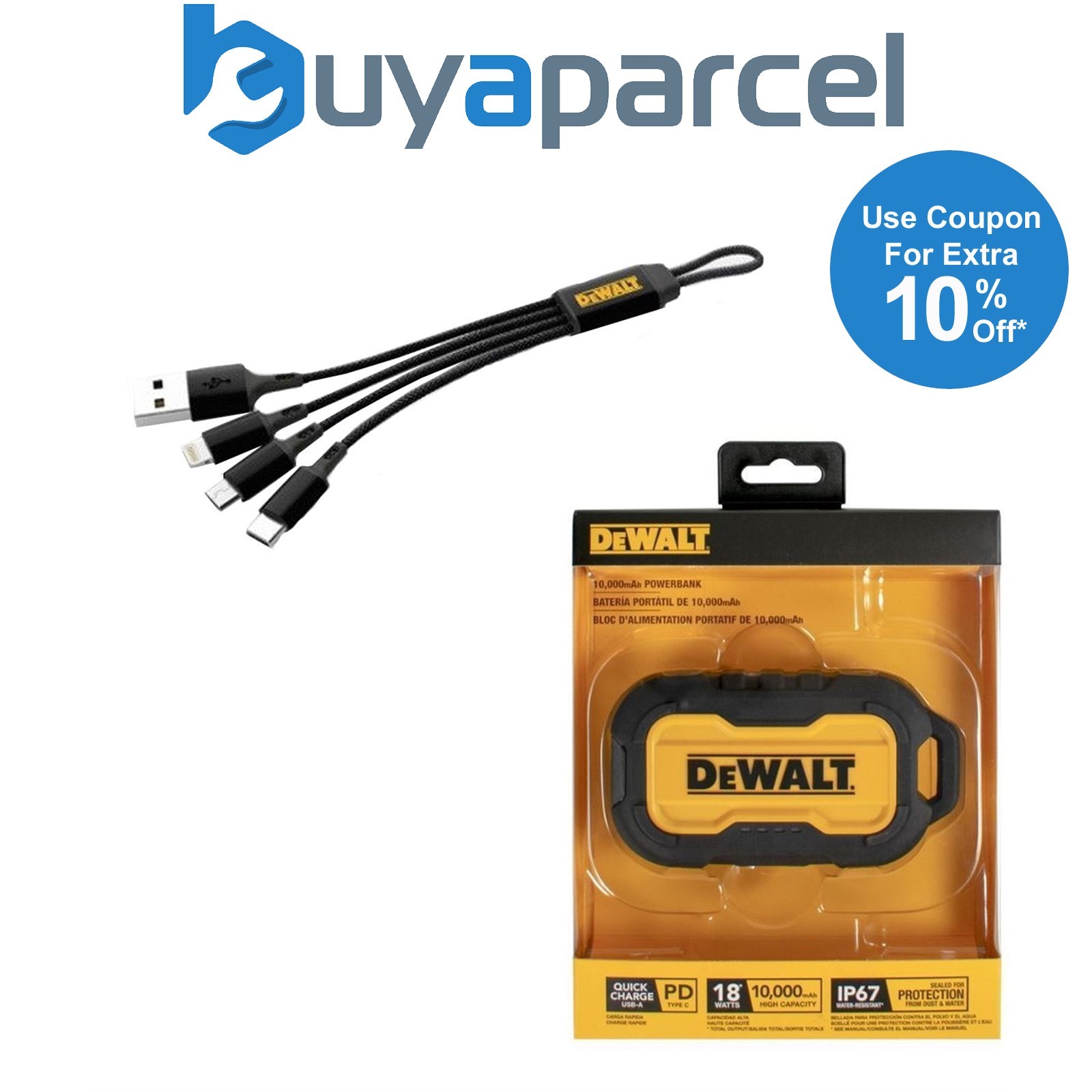 Dewalt Portable Powerbank Phone Charger 10,000mAh 2 Port IP67 + 3in1 Multi Cable