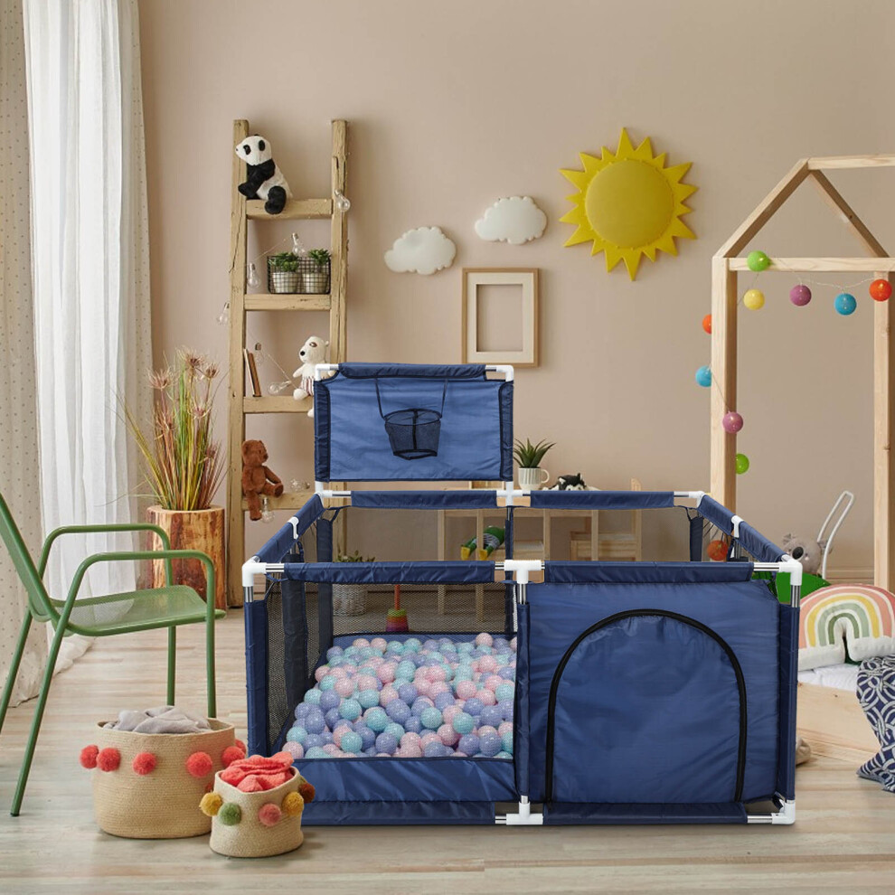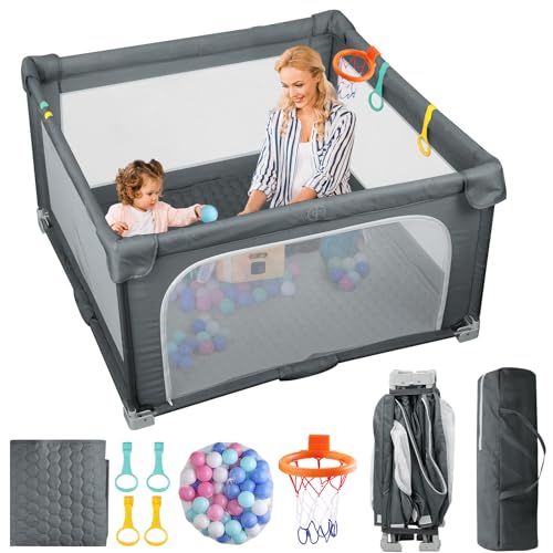 eSynic Large Foldable Baby Playpen 150 * 150cm with Soft Mat | Portable Indoor/Outdoor Playpen | Oxford Fabric, 50 Balls, Basketball Hoop & Handles | Travel-Friendly Design for Car, Home & Backyard