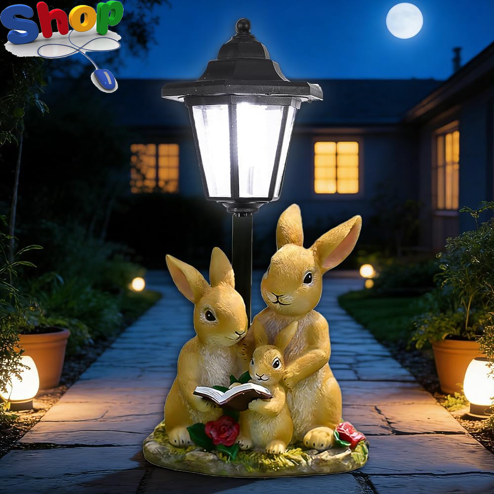 Solar Rabbit Family with Lantern Post Light, Solar Garden Ornaments Outdoor with