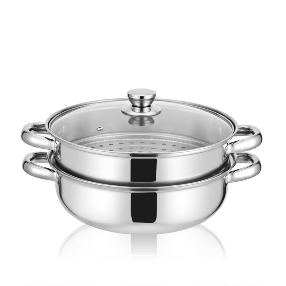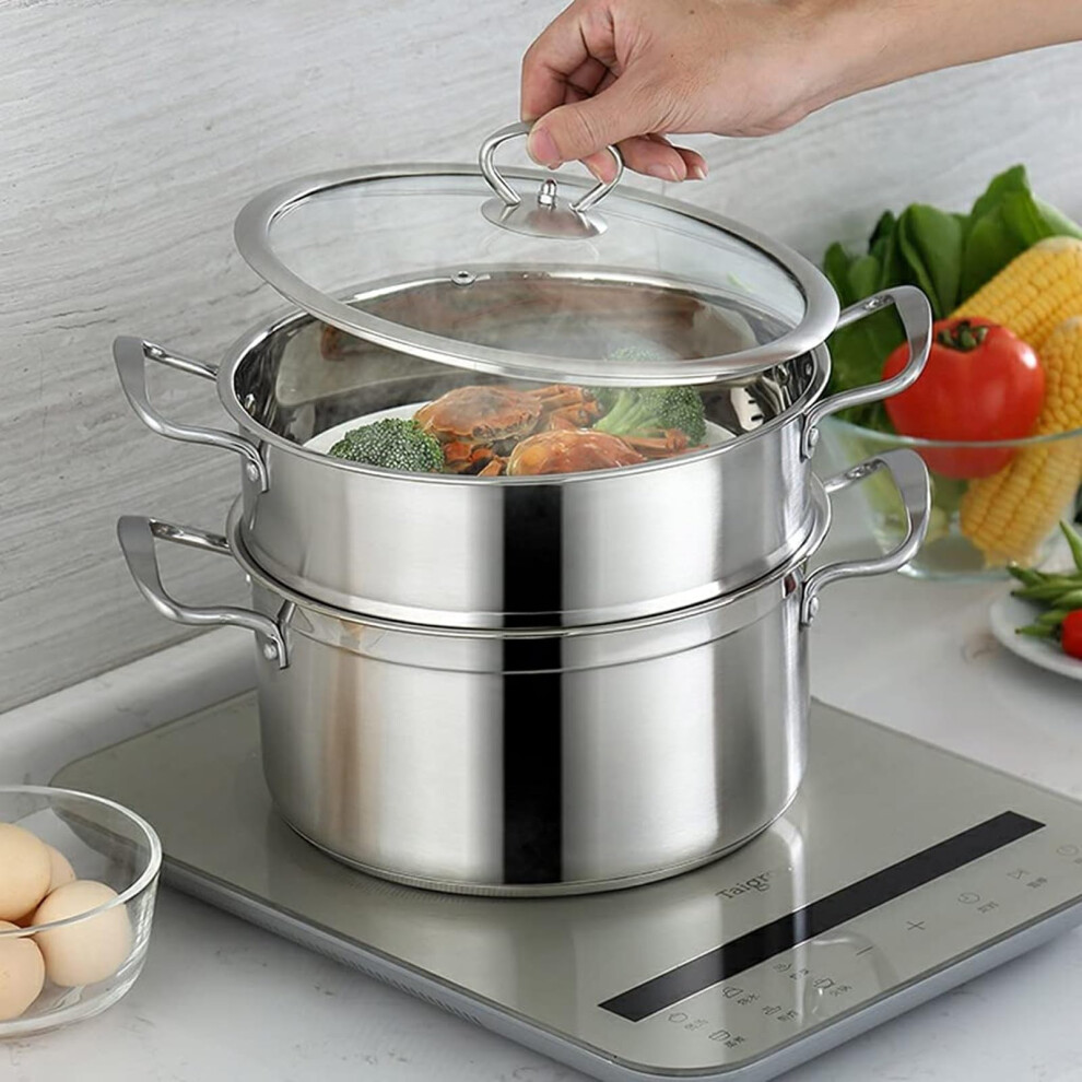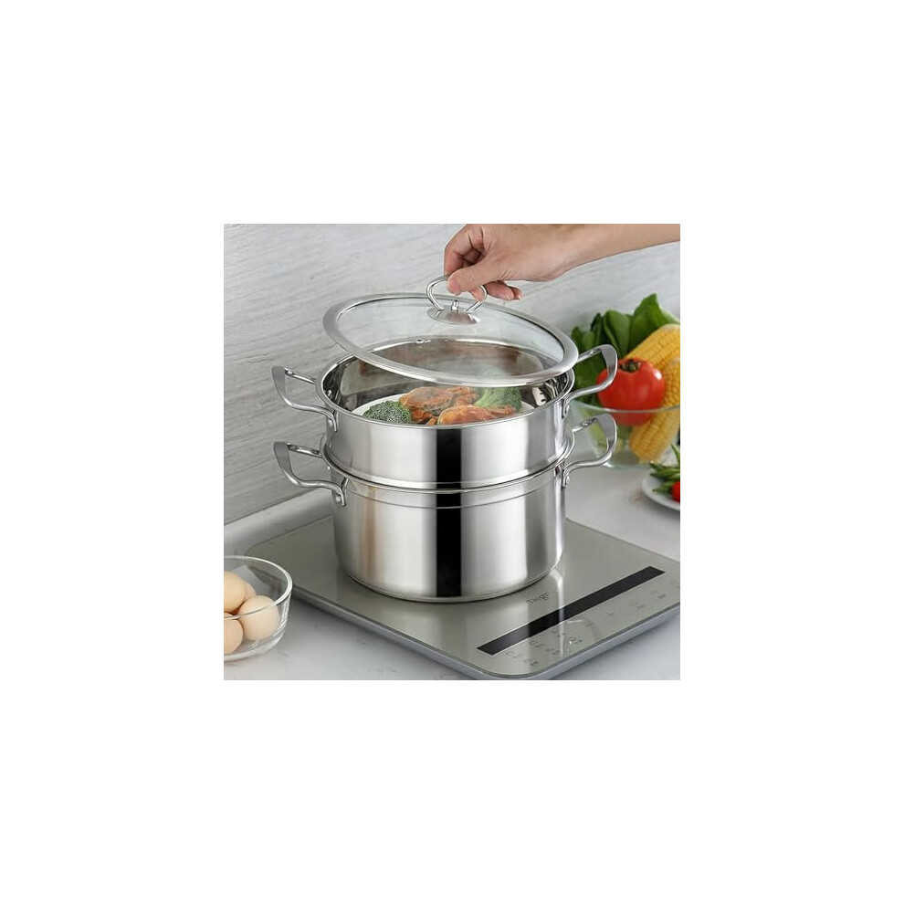 2 Tier Steamer Pot, Multi-purpose Steamer with Stainless Steel Double Handle and Brilliantly-polished Mirror Finish, Visual Design for Real-time Monit