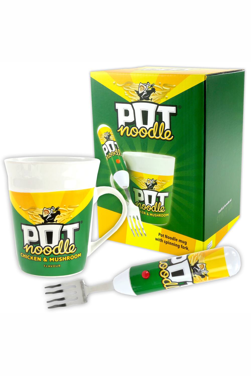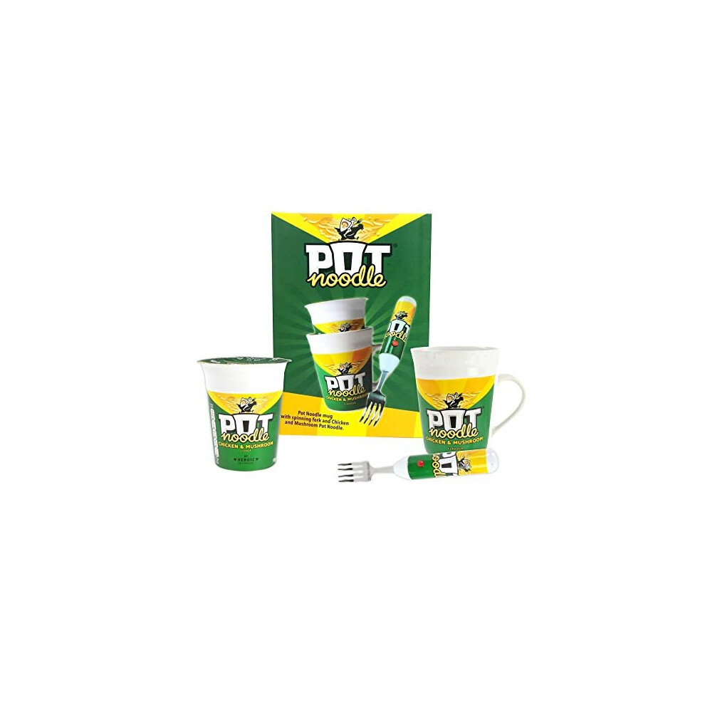 Pot Noodle Spinning Fork & Mug Gift Set - Funny Novelty Gifts for Men, Women, Includes Chicken and Mushroom Pot Noodle (90 grams)