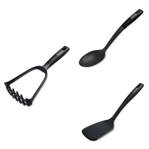 Fackelmann Bundle of PRO Solid Spoon, PRO Slotted Turner, Fackelmann PRO Potato Masher, Multi Functional, PBT Function Head, Soft Touch Handle, Black & Grey
