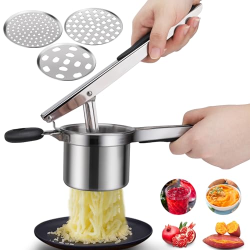 Potato Ricer Masher, Food Grade Stainless Steel Potato Ricer Press with 3 Interchangeable Discs, Multifunctional Ricer for Mashed Potatoes, Puree, Fruit & Vegetables, Baby Food