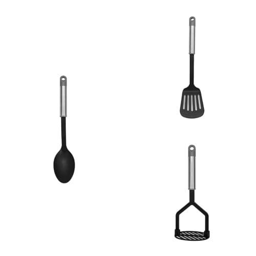 Fackelmann Bundle of MODE Serving Cooking Spoon, Slotted Turner Spatula, Potato Masher Food Crusher,PBT Plastic Non-Stick Function Head & Stainless Steel Handle with Hanging Loop, Black, Grey & Silver