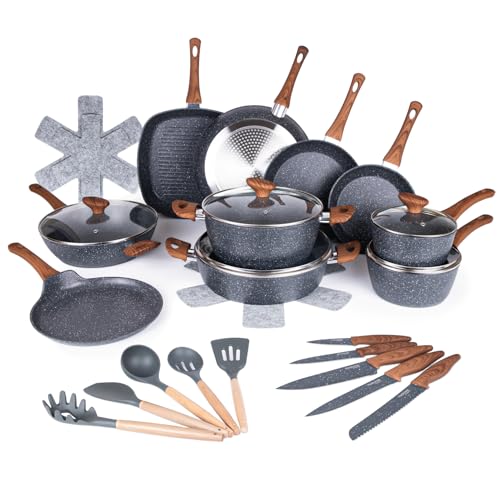 Pots and Pans Set Non Stick – Induction Hob Pot Sets – 35pcs Kitchen Cookware & Kitchen Knife Set – Marble Cooking Pots with Lids – Saucepans Pot & Frying Pans – by Nuovva