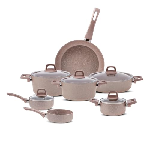 Karaca Bio Granite Cookware Set with Lids - 12 Piece Pots and Pans Sets Non Stick - 5 Pots with 5 Glass Lids & 1 Granite Frying Pan & 1 Saucepan Cooking Set - PFOA Free Kitchen (Rosegold)