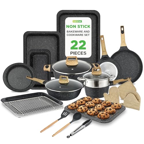 Nutrichef Pots and Pans Set, Non Stick Cookware Set 22-Piece, Induction Ready Kitchen Cookware, Multi-Sized Pots, Frying Pans, Bakeware, Pan Sets with Lids, Brown