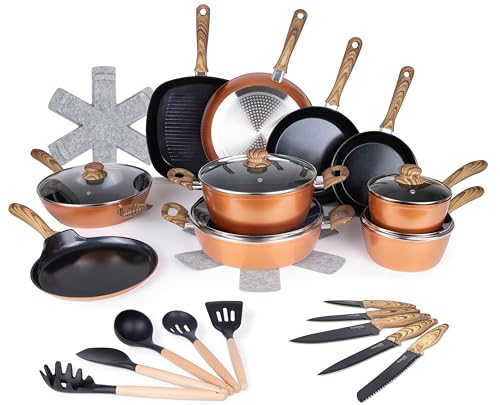 Pots and Pans Set Non Stick – Induction Hob Pot Sets – 35pcs Kitchen Cookware & Kitchen Knife Set – Copper Cooking Pots with Lids – Saucepans Pot & Frying Pans – by Nuovva
