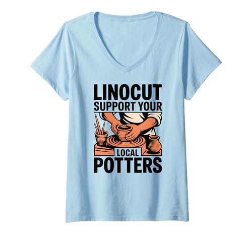 Women's Linocut Support Your Local Potters Pottery Wheel V-Neck T-Shirt