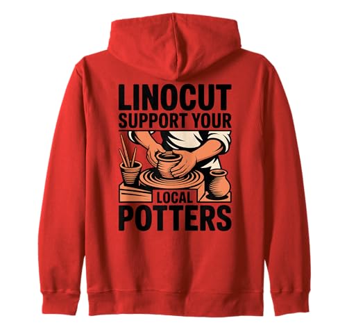 Linocut Support Your Local Potters Pottery Wheel Zip Hoodie