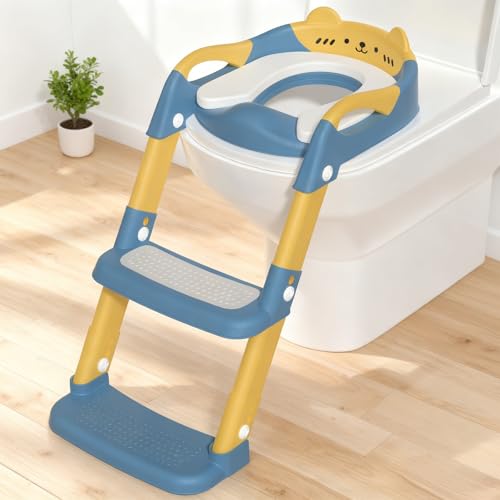 Potty Training Toilet Seat Toddler Toilet Seat with Step Kids Toilets Steps for Toddlers Child Baby Boy Girl Anti Splash Soft Cushion Handle Adjustable Potty Training with Ladder in Bathroom, Blue