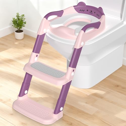 Potty Training Toilet Seat Toddler Toilet Seat with Step Kids Toilets Steps for Toddlers Child Baby Boy Girl Anti Splash Soft Cushion Handle Adjustable Potty Training with Ladder in Bathroom, Pink