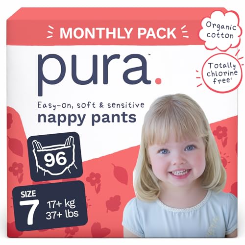 Pura Nappy Pants Size 7, 96 Count, 17kg+, 360° Stretch Fit, Potty Training Pants for Hypoallergenic & Sensitive Skin, Up to 12 Hours Overnight Leak Protection, Totally Chlorine Free