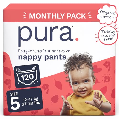 Pura Nappy Pants Size 5, 120 Count, 12-17kg, 360° Stretch Fit, Potty Training Pants for Hypoallergenic & Sensitive Skin, Up to 12 Hours Overnight Leak Protection, Totally Chlorine Free