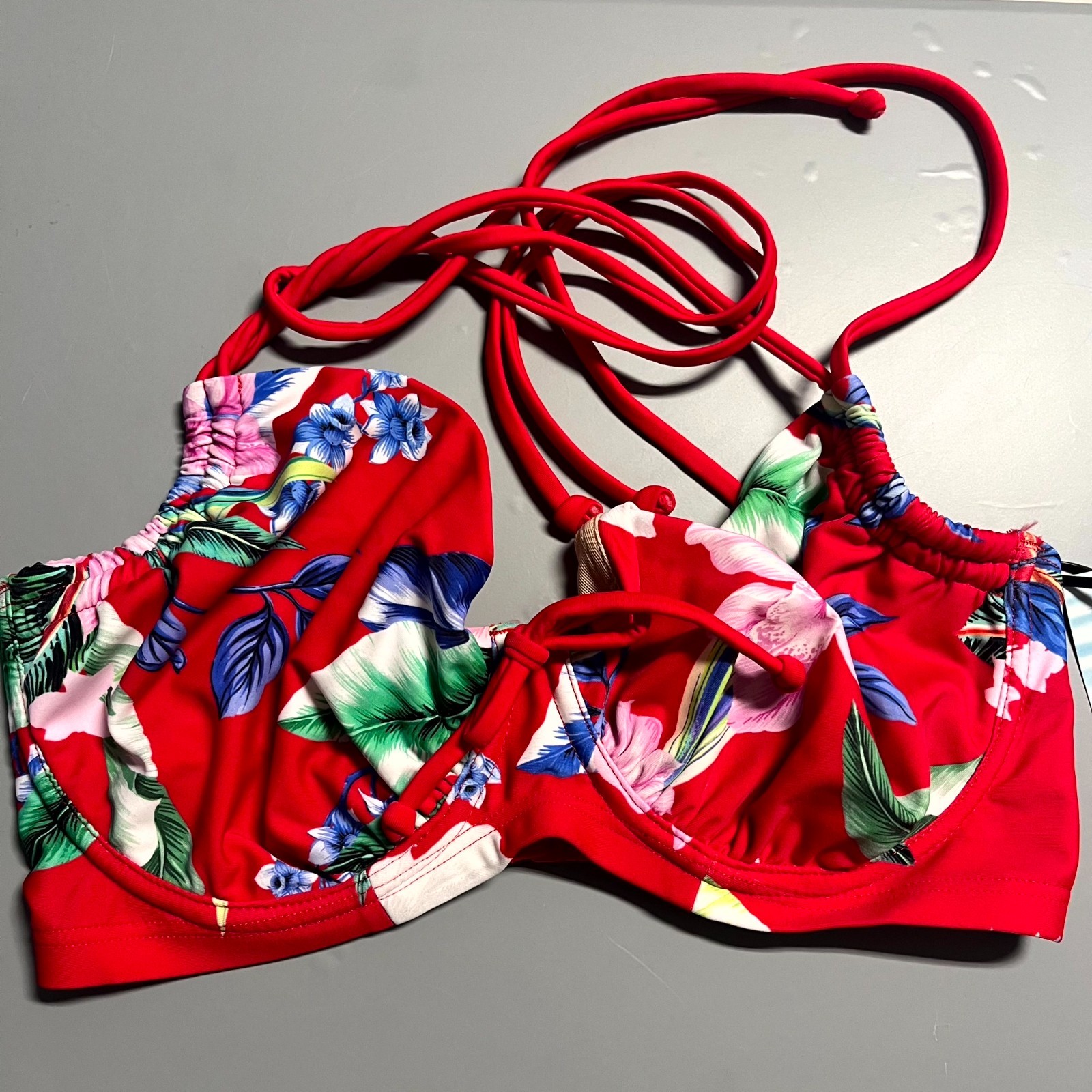 Pour Moi Miami Brights Bikini Top Women's 32F Red Tropical Halterneck Underwired