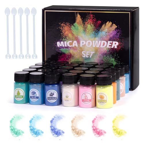 Mica Powder - 32 Pearlescent Epoxy Resin Colour Pigment Set- Natural Cosmetic Grade Pigment for Soap Dye, Lip Gloss, Nail Polish, Makeup, Epoxy Resin, Candle Making, Bath Bombs, Slime, 5g/0.18oz