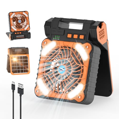 Smiling Shark Portable Camping Fan, 6000 mAh Rechargeable Solar Tent Fan Light 4 Speeds Powerful Wind 3 Timer 90° Foldable Cordless LED Desk Fans with Power Bank for Camping Fishing Ourdoor Hiking
