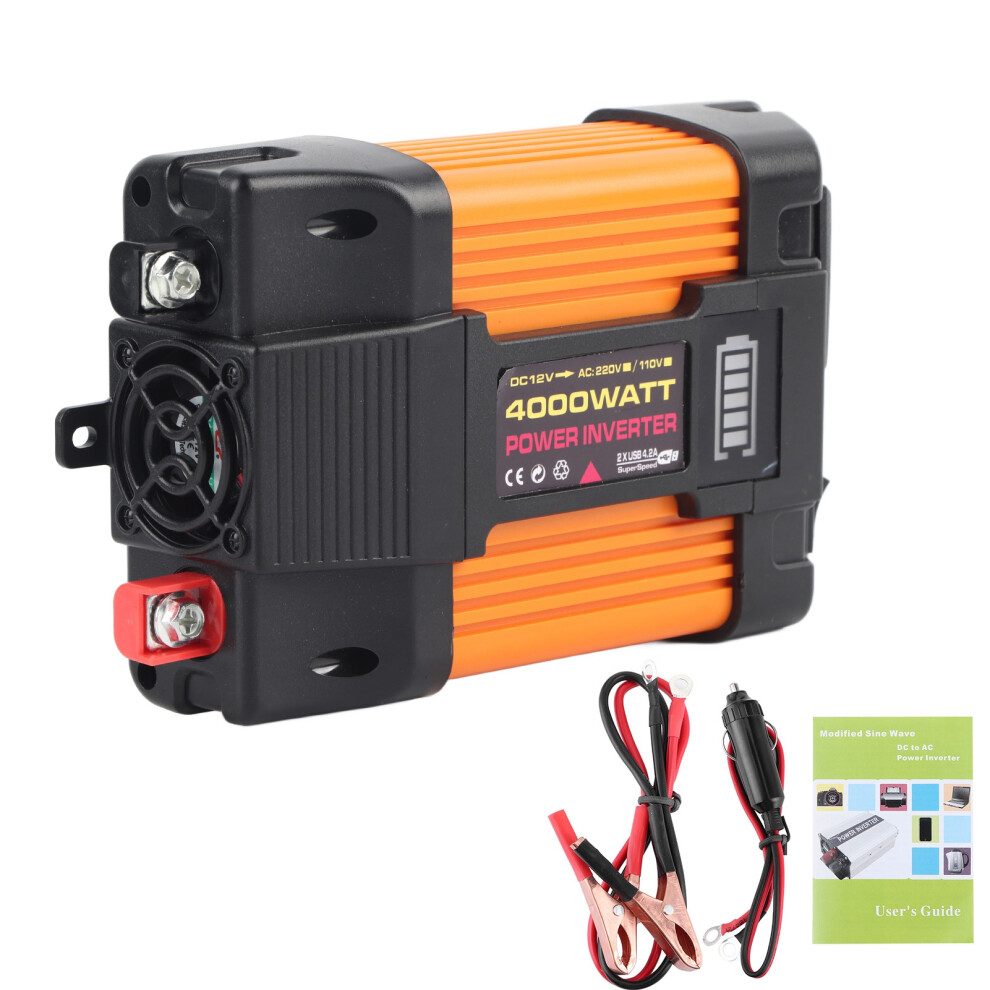 High-Efficiency Power Inverter, Modified Sine Wave Car Plug Adapter, 4000W Peak Power DC 12V to AC Conversion, Aluminum Metal Heat Dissipation for