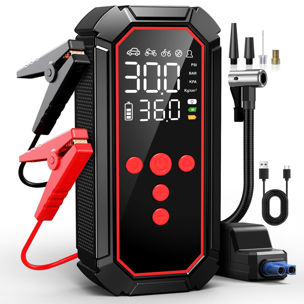 NHOWIN Jump Starter Power Pack, 4-IN-1 Car Battery Booster (Up to 8.5L Gas or 5.0L Diesel Engine) with Leads, Portable Car Jump Starter Power Bank wi