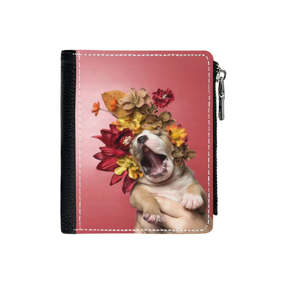(Flower Power, Luvable Puppy_44) PU Wallet Compact Bifold with Zipper & Multiple Card Coins Slots Black Stylish Durable Graphic Design Print for Men W