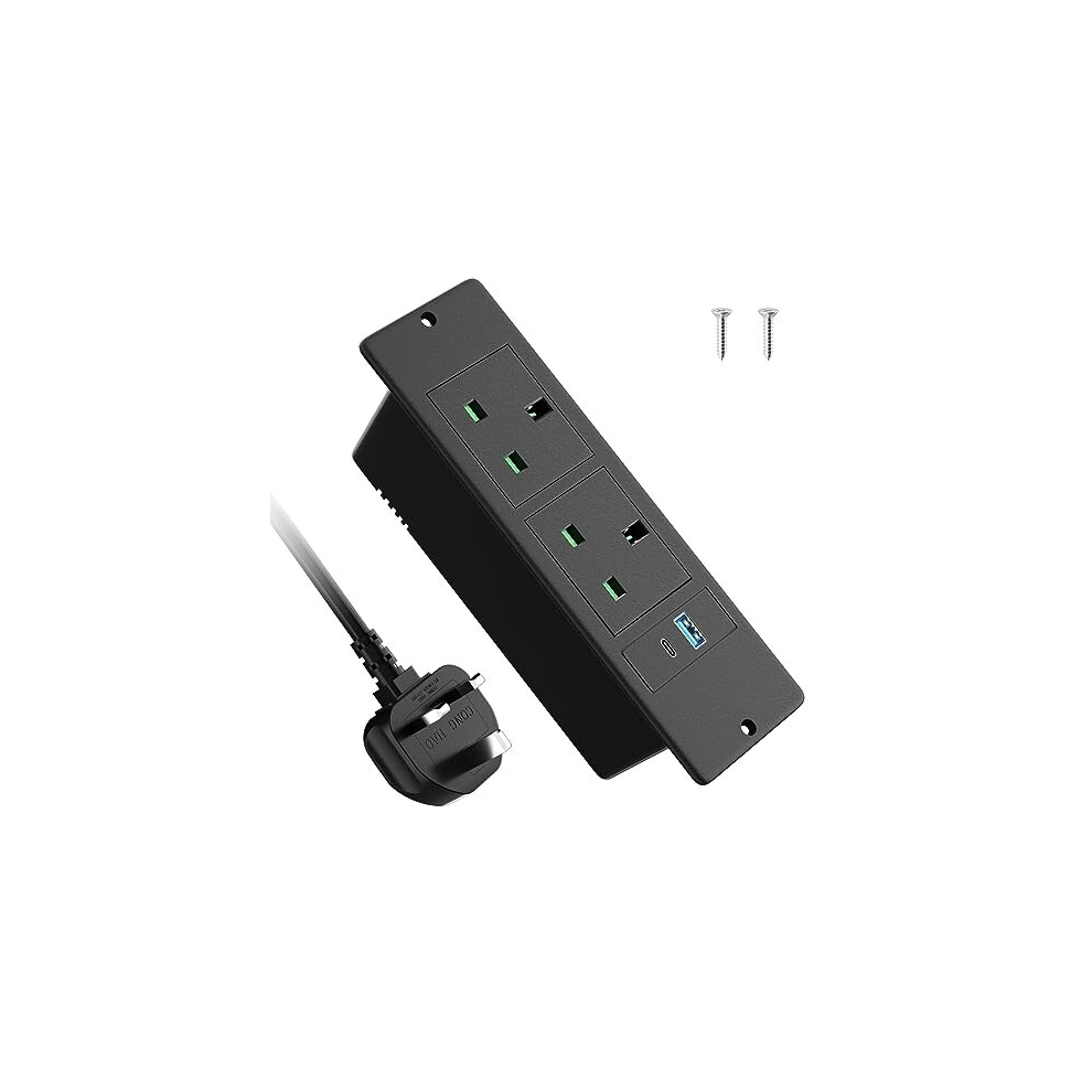 Recessed Power Strip with USB C PD20W, Desk Power Socket with USB, Power Extension Lead 2 Outlets 2 Screws, Hidden in Furniture Desk Table, 2M/6.6FT Cable, Black