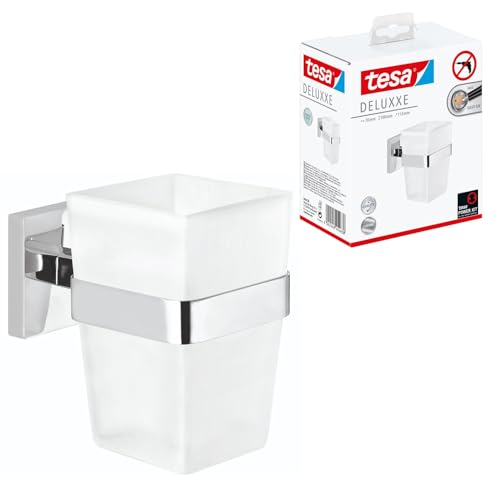 tesa DELUXXE Toothbrush Holder - Self-Adhesive, Stainless-Steel Tooth Brush Holder with Frosted Glass Cup - Waterproof, incl. Power.Kit Adhesive Solution - 100mm x 70mm x 113mm