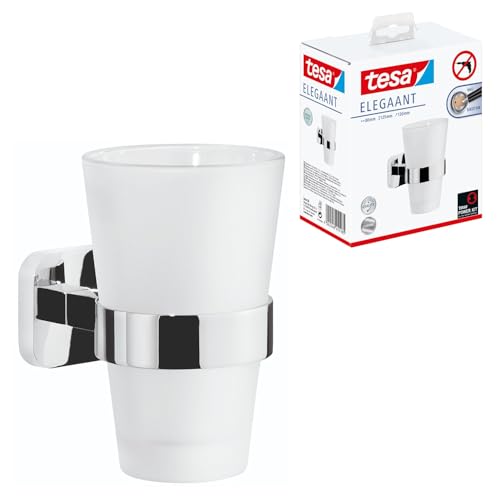 tesa ELEGAANT Toothbrush Holder - Self-Adhesive, Stainless-Steel Tooth Brush Holder with Frosted Glass Cup - Waterproof, incl. Power.Kit Adhesive Solution - 125mm x 80mm x 120mm