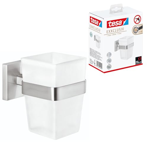 tesa EXXCLUSIV Toothbrush Holder - Self-Adhesive, Stainless-Steel Tooth Brush Holder with Frosted Glass Cup - Waterproof, incl. Power.Kit Adhesive Solution - 100mm x 70mm x 113mm