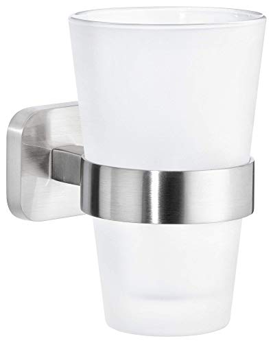 tesa EXXCELLENT Toothbrush Holder - Self-Adhesive, Stainless-Steel Tooth Brush Holder with Frosted Glass Cup - Waterproof, incl. Power.Kit Adhesive Solution - 125mm x 130mm x 105mm