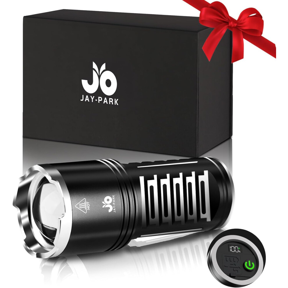 JAY-PARK Torches LED Super Bright 1000000 Lumens, High Power Torch Rechargeable with 10800mAh Battery and LCD Battery Indicator Display, 5 Modes, Zoomable Long Beam (3000m) IPX7 Waterproof for Camping