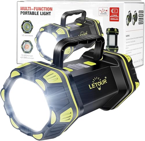 LETOUR Rechargeable LED Torch, 4000Lumens Multi-Functional Camping Light Super Bright Flashlight 8 Modes LED Searchlight, 4800mAh Power Bank, IP65 Waterproof Outdoor Tent Spotlight Lantern
