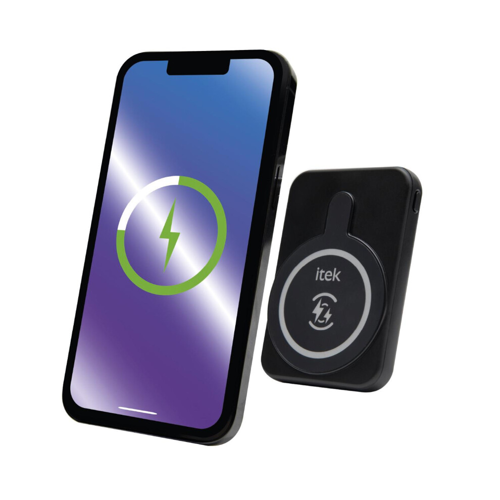 iTek I58074BLK 5000mAh Powerbank with Wireless MagSafe Charger, Instant Charging, Pocket Sized, Indicator Light, Black