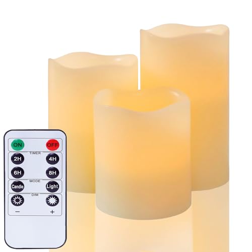 flameless Candle, with Embedded Fairy String Lights, 3-Piece LED Candle, with 10-Key Remote Control, 24-Hour Timer Function, Dancing Flame, Real Wax, Battery-Powered. (Ivory White)