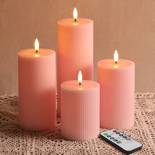 Eywamage Pink Ribbed Flameless Pillar Candles with Remote, Flickering LED Wax Candles Battery Powered Set of 4