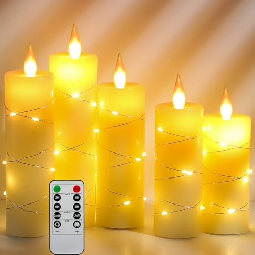 LED Candle, with Embedded Fairy String Lights,5-Piece LED Candle, with 10-Key Remote Control, 24-Hour Timer Function, Dancing Flame, Real Wax, Battery-Powered. (Ivory White)