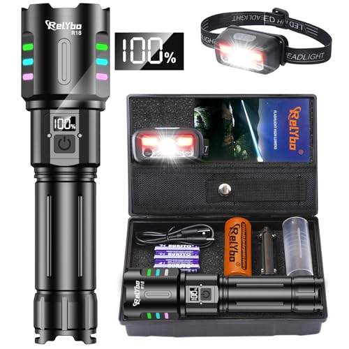 Relybo Torches Led Super Bright Rechargeable, 1000000 Lumens Flashlight Torches Battery Powered, 10 Modes Camping Torch, Powerful Torch Flash Light for Dog Walking Hiking Camping Emergency Gift