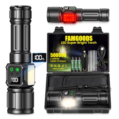 Famgoods Rechargeable Torch, 500000 Lumens Super Bright Torches Led, IP67 Waterproof, Adjustable Focus & Magnetic Base, 9 Lihghtning Modes Flashlight Powerful Tactical Torch for Camping Emergency Gift