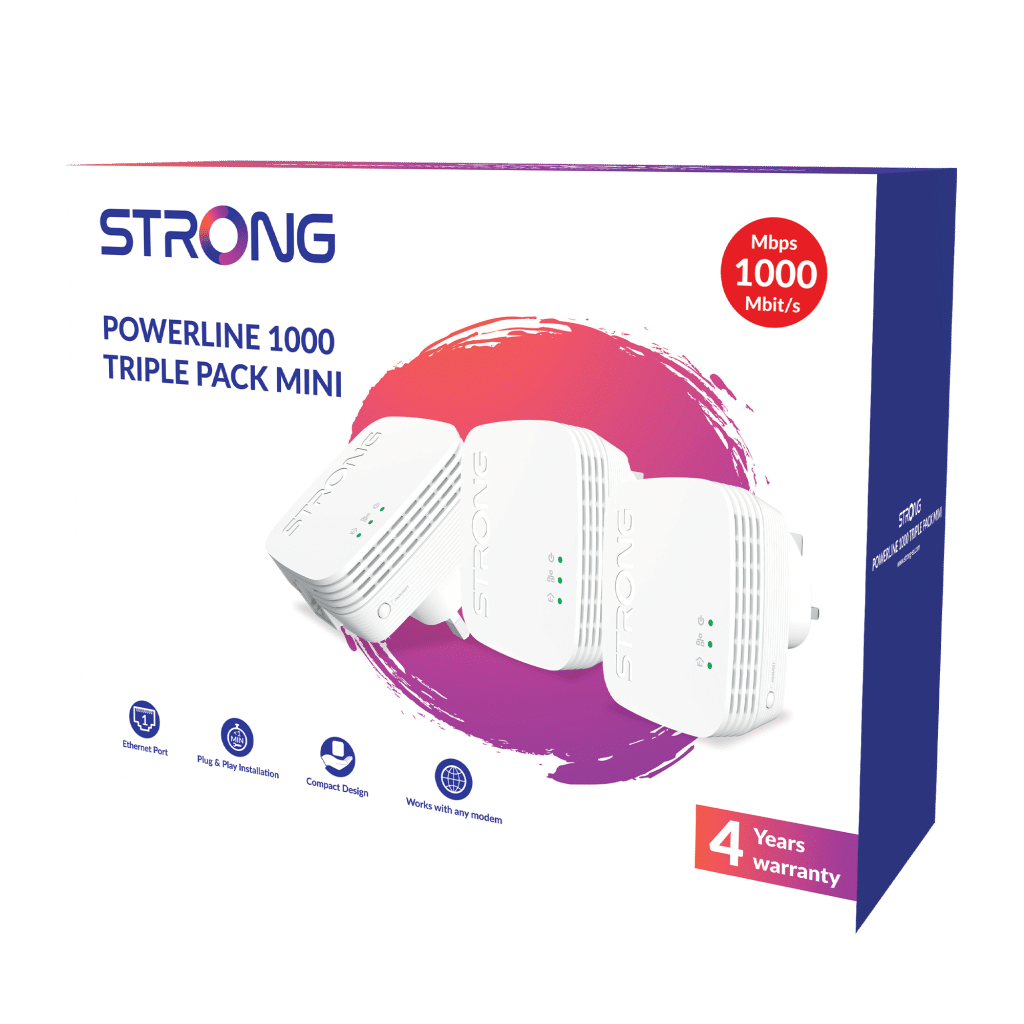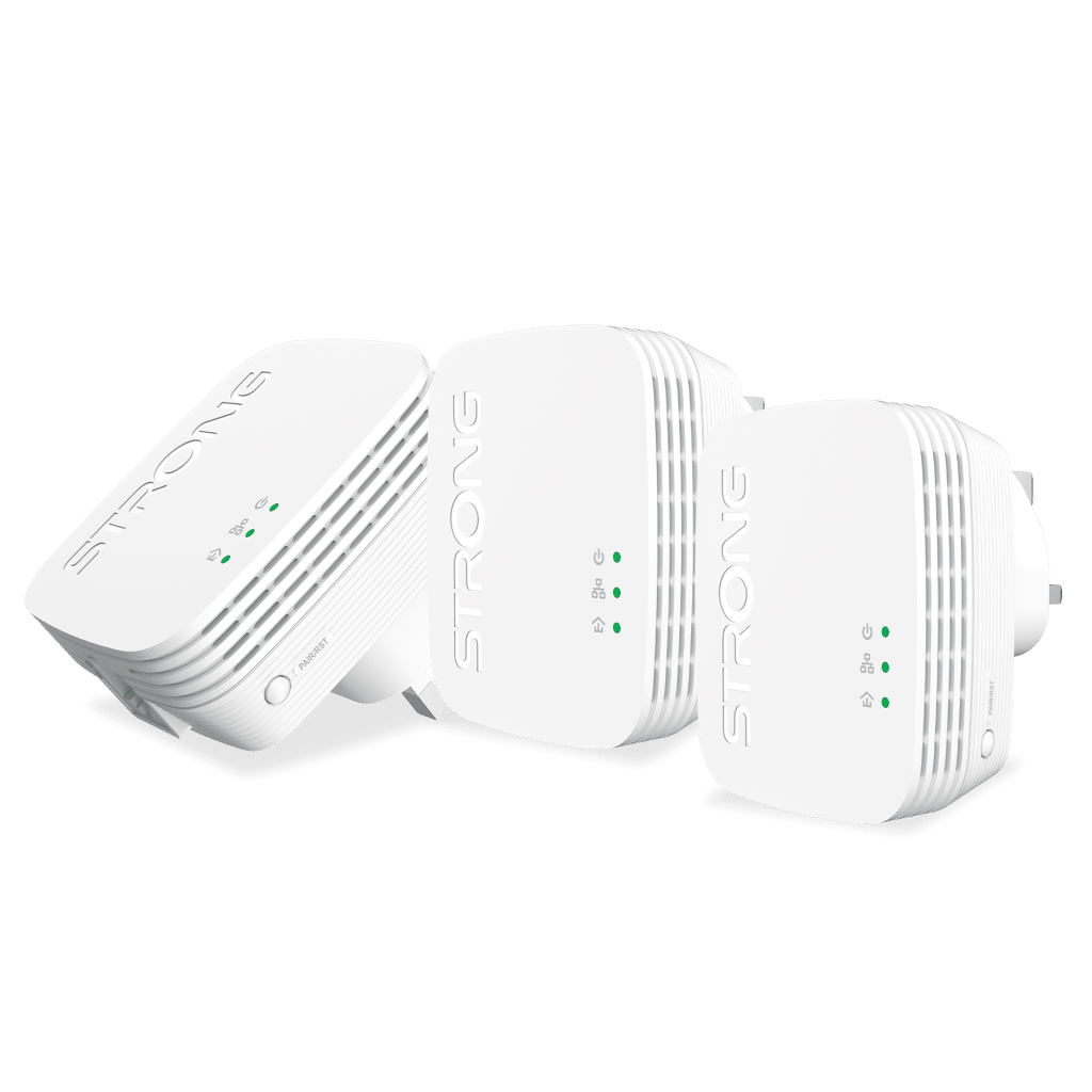 STRONG POWERL1000TRIMINIUK AV1000 Mini Powerline Adapter Starter Kit, Pack of 3, Up to 300m Range, No Configuration Required, UK Plug White