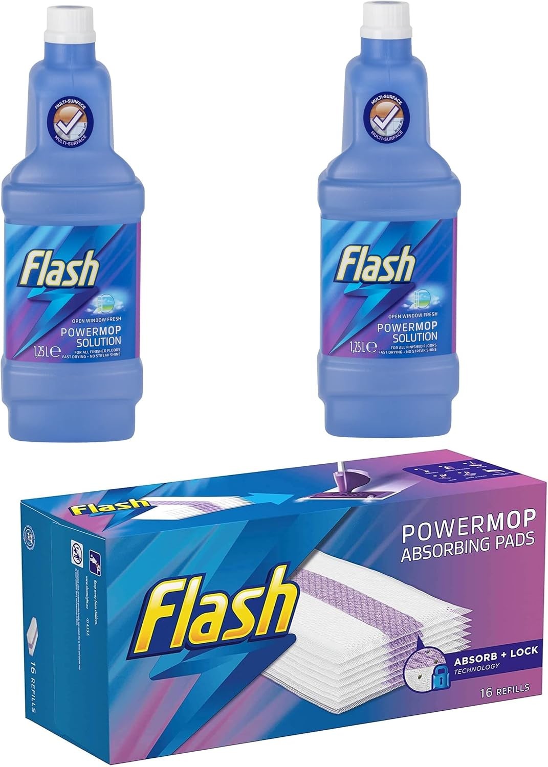 Flash Cleaning Bundle: Powermop Solution Refill Liquid, Floor Cleaner, Fresh, 5 Litres (1.25 L x 4) + Absorbing Pads, 64 Count (16 4