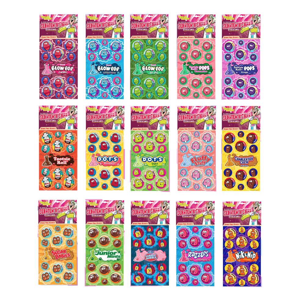 Dr. Stinky's Scratch N Sniff Stickers Favorite Candy 15-Pack- Blow Pop Tootsie Roll Pop Tootsie Roll Dots Fluffy Stuff Charleston Chew Sugar Bab