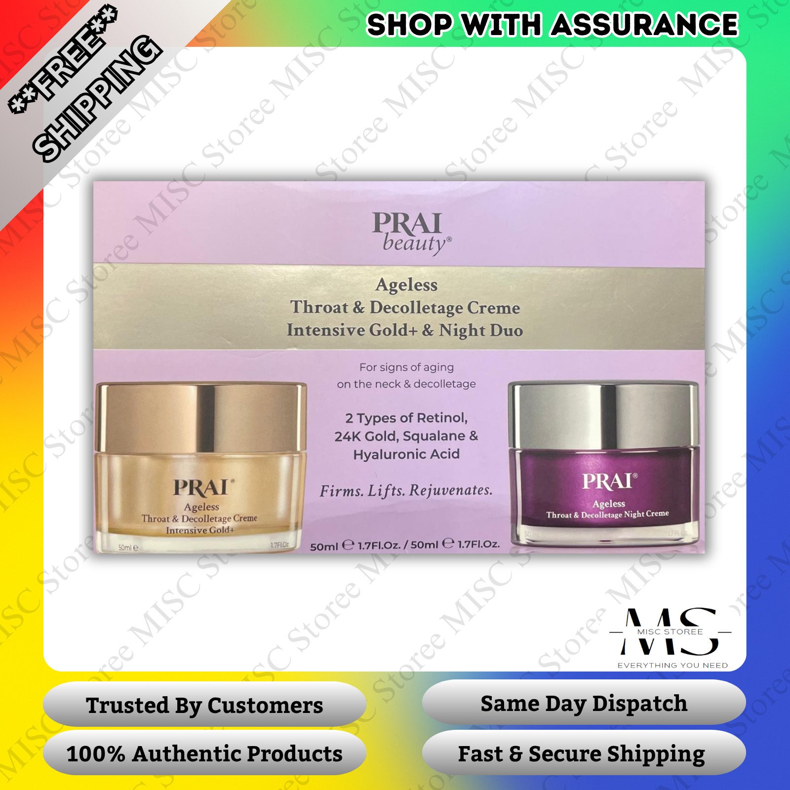 PRAI Beauty Ageless Day & Night Neck Kit | 1 Throat & Decolletage Day Creme and 1 Throat & Decolletage Night Creme | Skin Tightening Cream Set fo