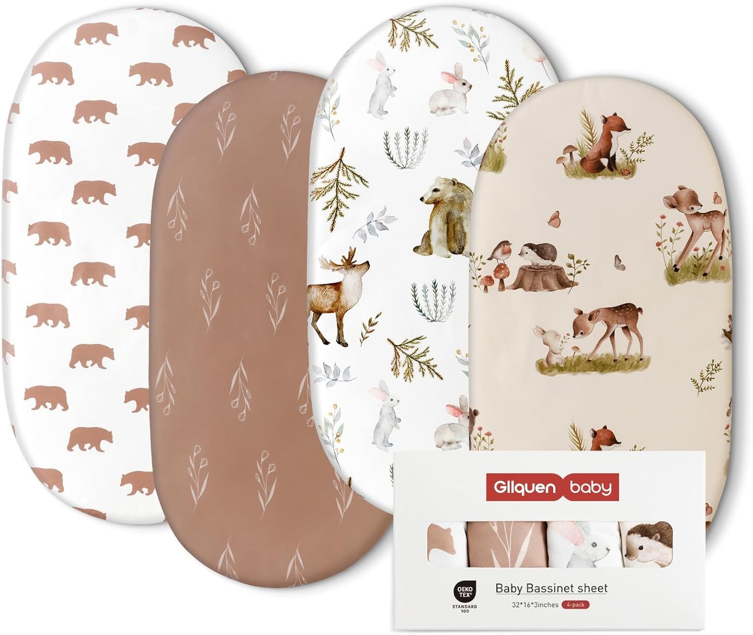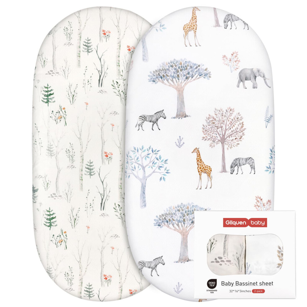 GLLQUEN BABY 4Pack Moses Basket Fitted Sheets, Newborn Pram Sheets Fitted, 100% Microfiber Oeko-tex100 Cozy and Breathable Crib Baby Bassinet Sheets for Boy and Girl(Forest Deer)