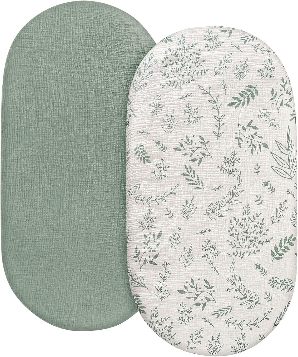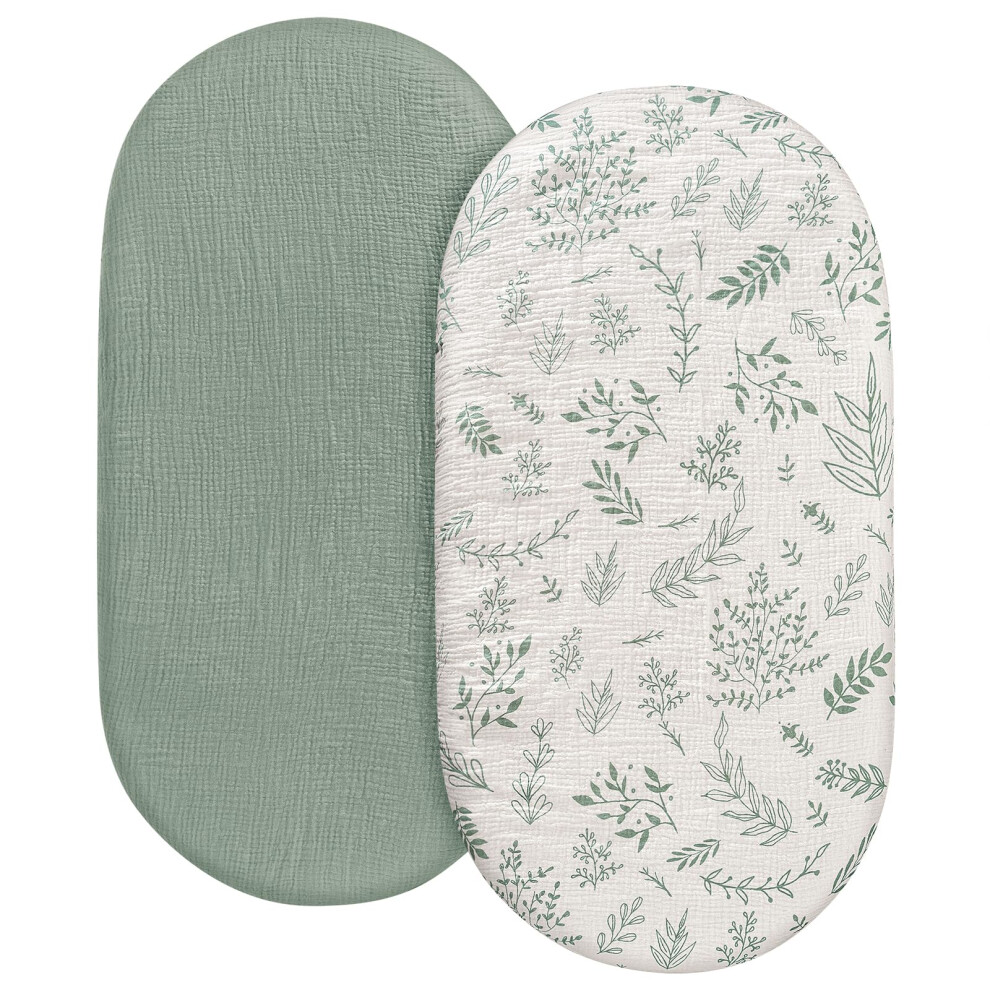 Peepeemax Moses Basket Sheets 80x40 cm, 100% Cotton Pram Sheets Fitted, Muslin Bassinet Sheet for Boys and Girls, Baby Crib Fitted Sheets Fit for Oval Rectangle Matress, 2 Pack (Green)