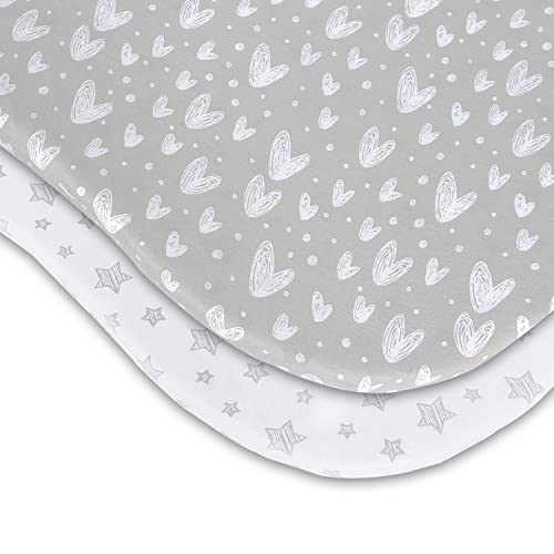 SPRINGSPIRIT Baby Pram Sheets/Moses Basket Fitted Sheets 2 Pack, 100% Cotton Pram Carry Cot/Moses Basket Mattress Cover, Fits for mattress approx 75-78x30-35cm, Stars & Hearts Print
