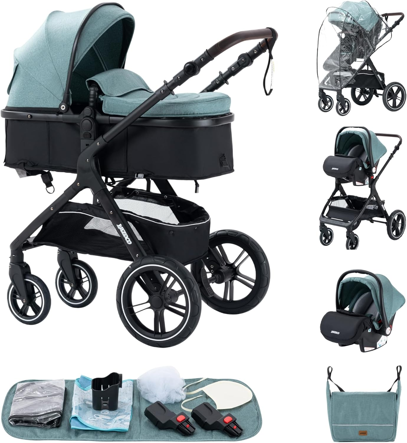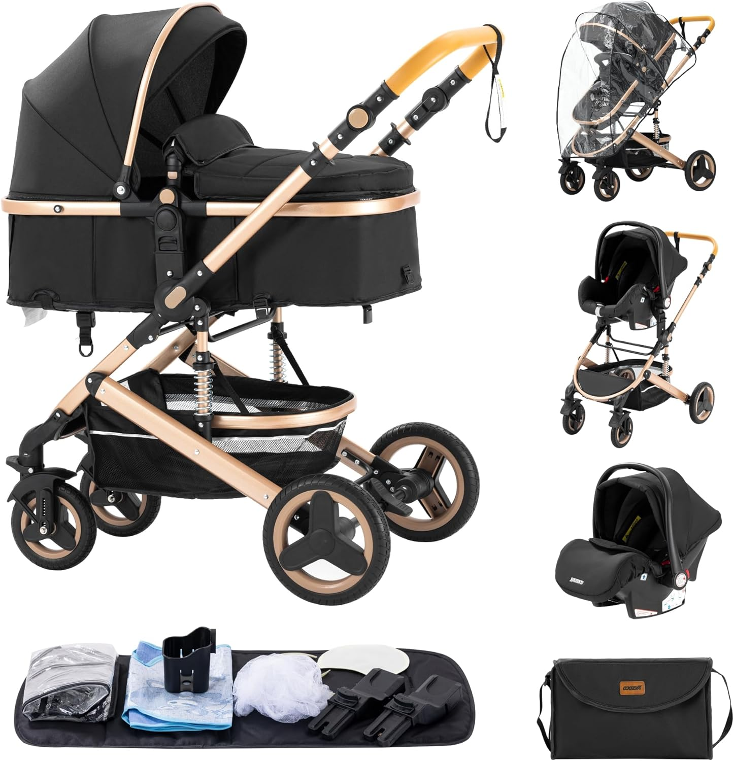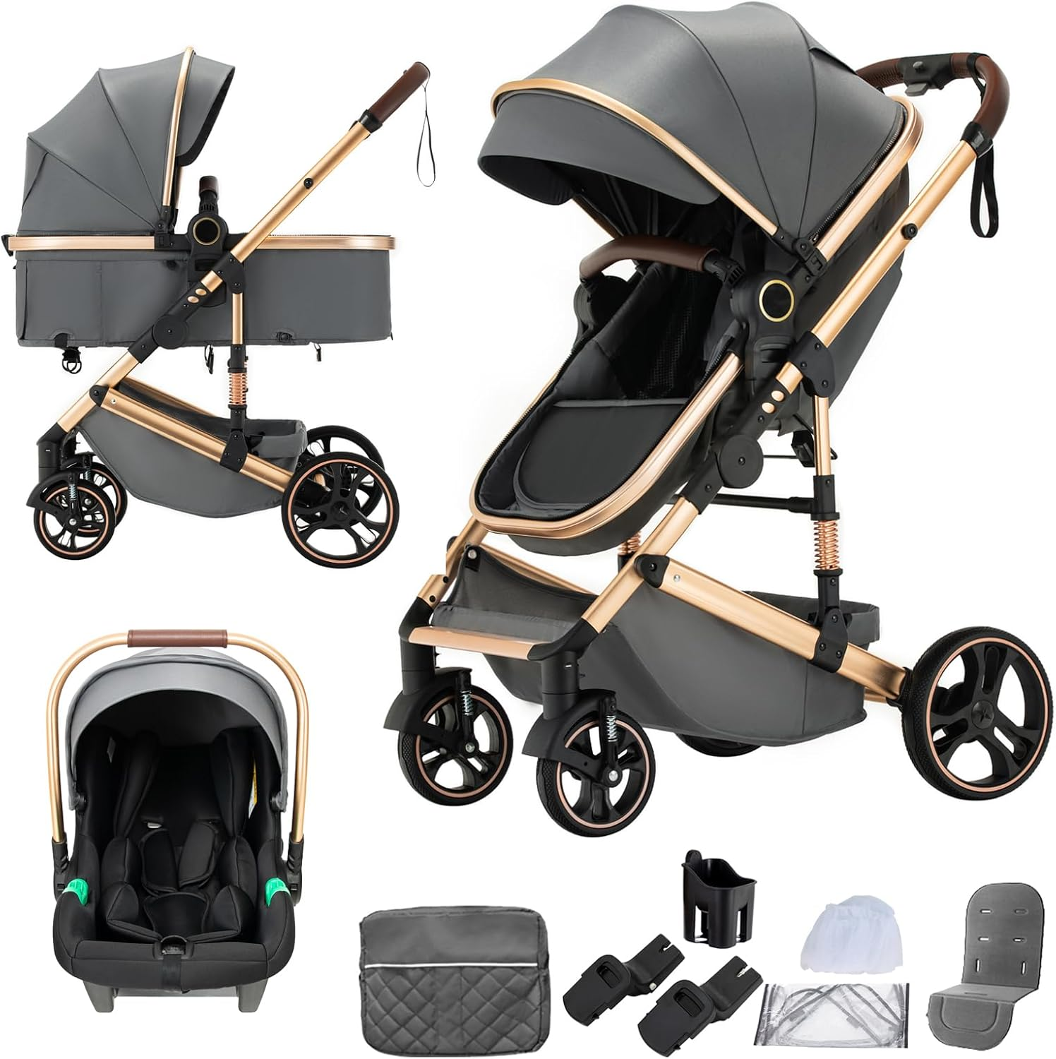 Gcarebb 3 in 1 Prams Travel System, Pushchair with Height Adjustable Handle, Travel Pram with Mosquito Net, Baby Stroller with Aluminum Frame for New
