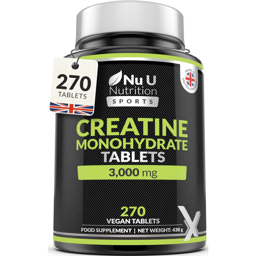 Nu U Nutrition - Creatine Monohydrate Tablets 3000mg - 270 Vegan Tablets - 3 Month Supply - Pre Workout Supplement for Men & Women - Powder