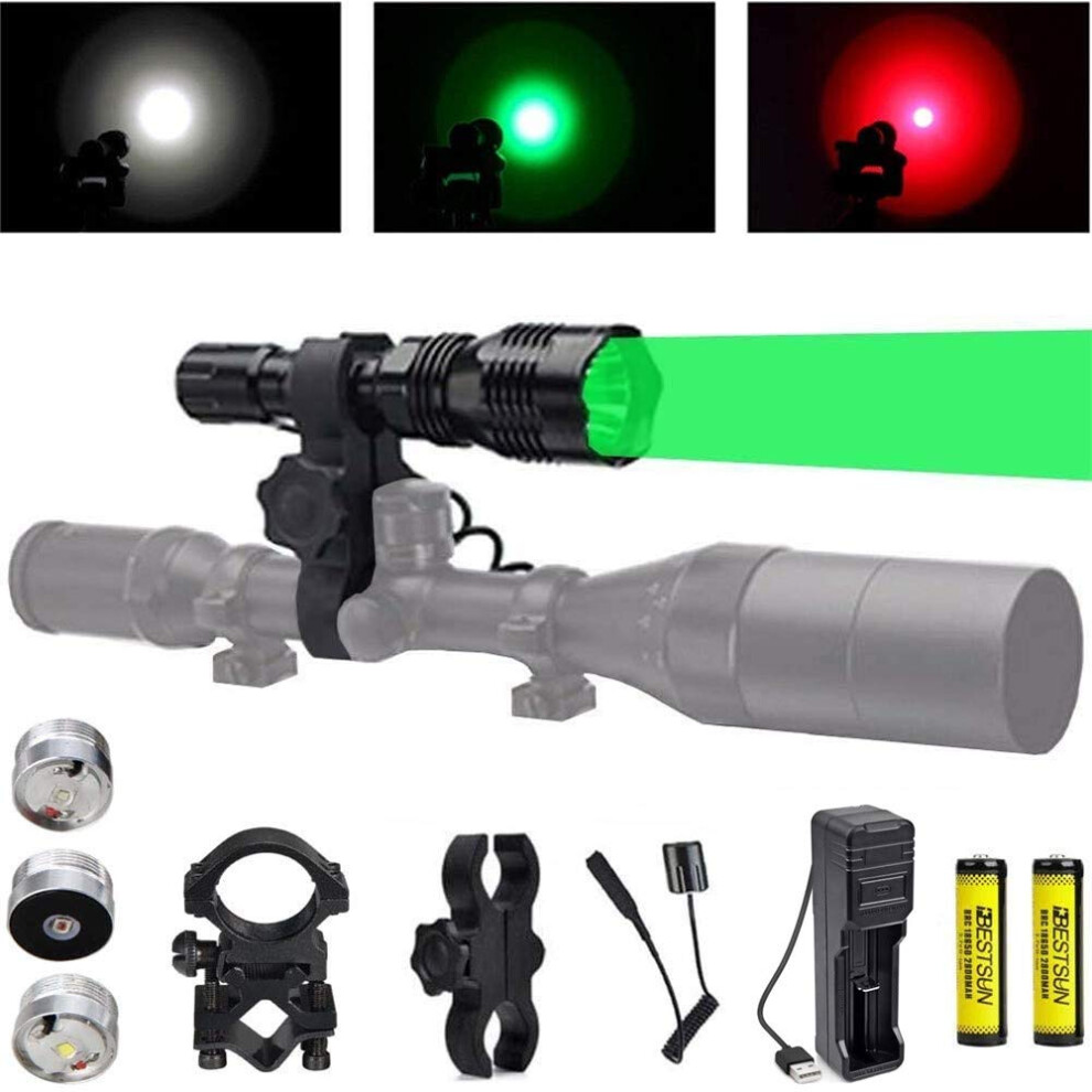 LUXJUMPER Predator Light with Green Red White LED Hunting Torch, 350 Yards Hunting Light with Pressure Switch, Rifle Barrel & Scope Mount for Hogs