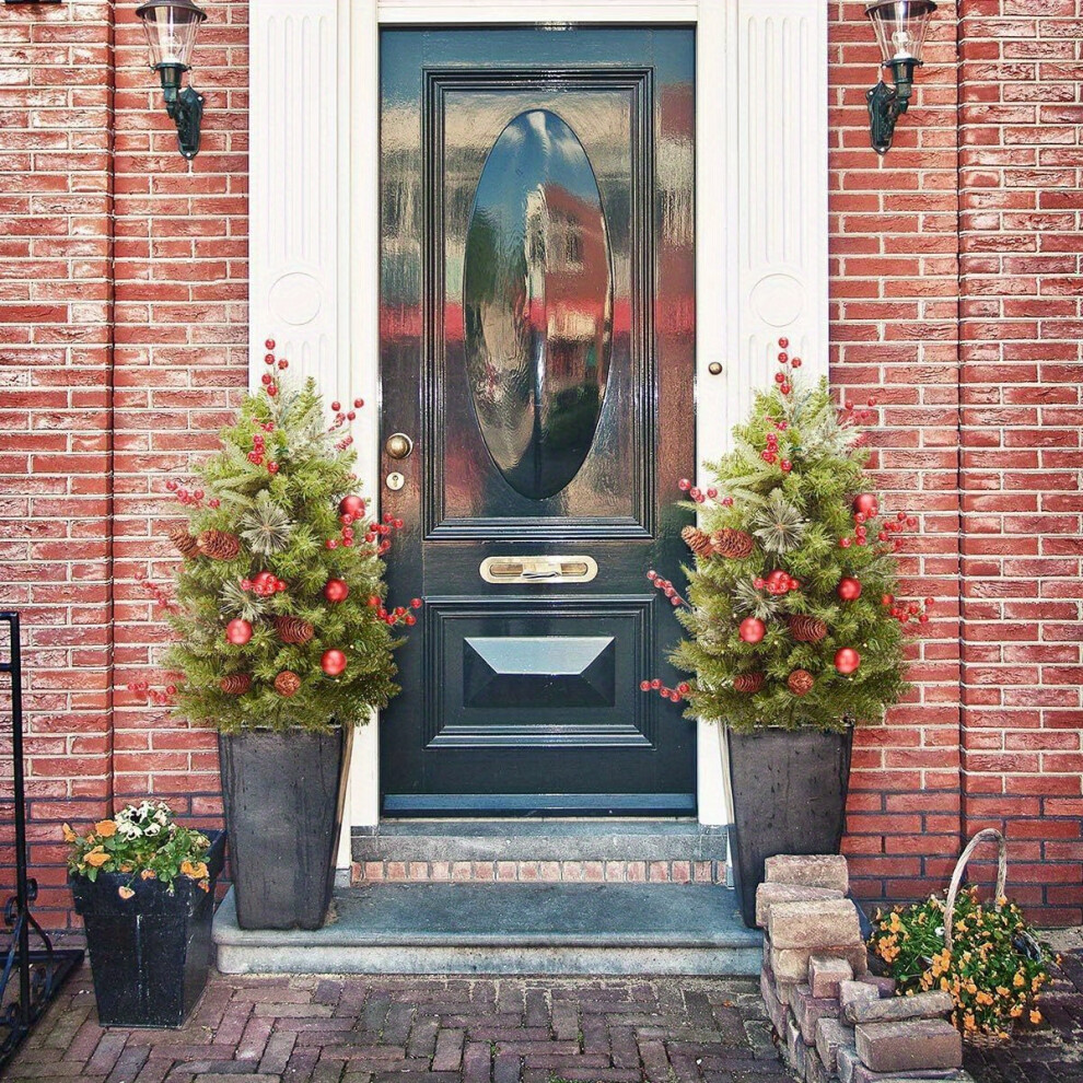 2 Pack Prelit Artificial Christmas Trees 18in with Pinecones and Berries for Outdoor Porch Decor